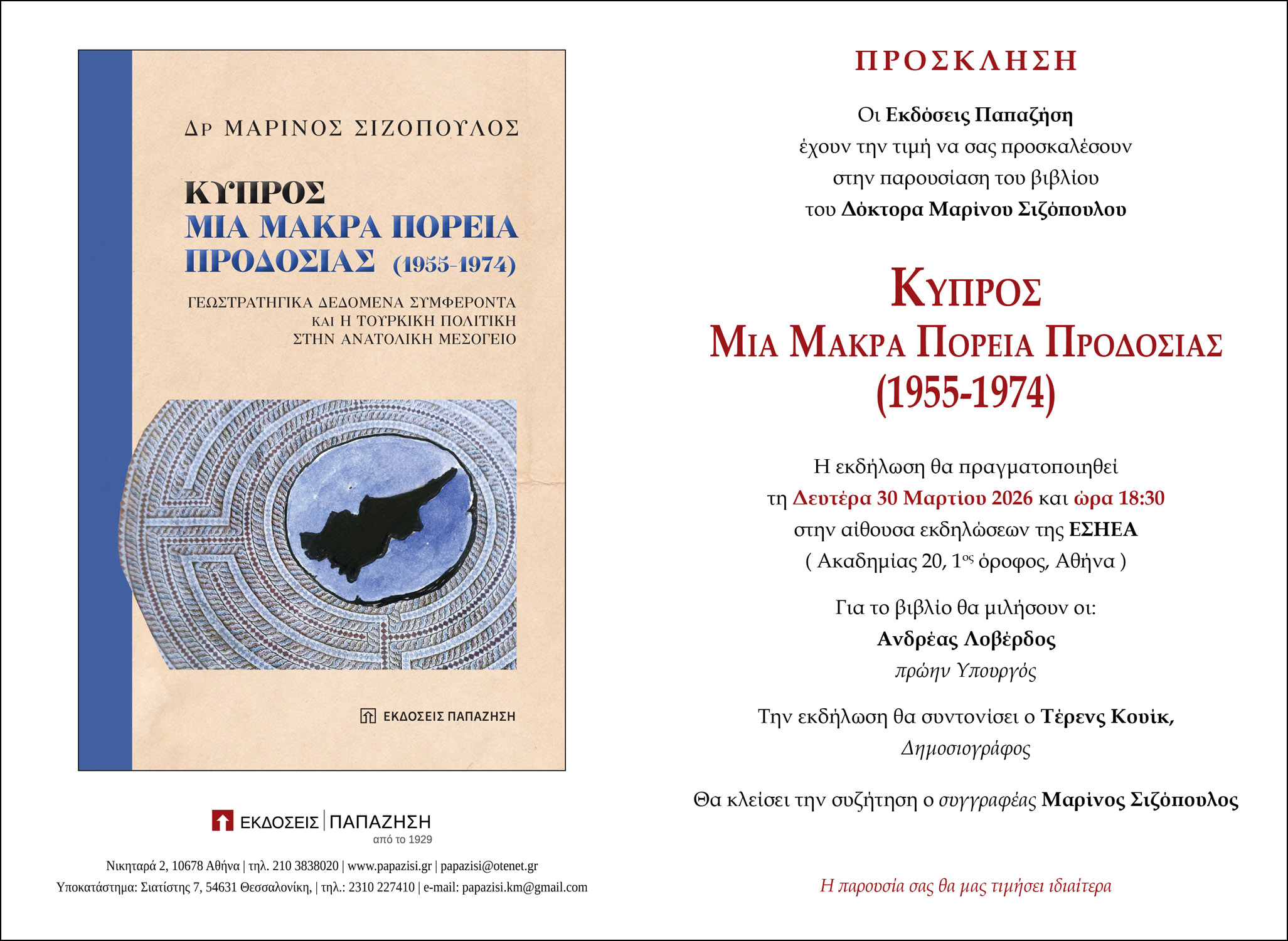 Οι Εκδόσεις Παπαζήση έχουν την τιμή να σας προσκαλέσουν στην παρουσίαση του βιβλίου του Δόκτορα Μαρίνου Σιζόπουλου