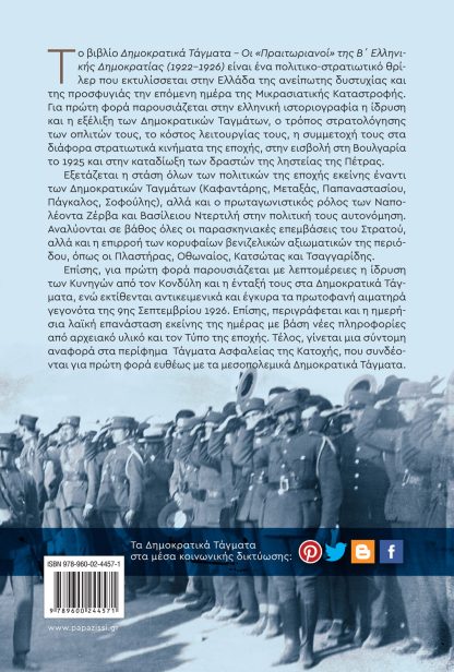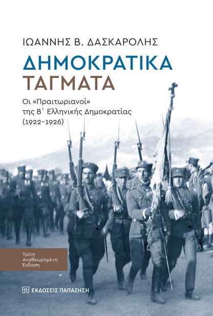 Το βιβλίο Δημοκρατικά Τάγματα – Οι «Πραιτωριανοί» της Β΄ Ελληνικής Δημοκρατίας (1922–1926) είναι ένα πολιτικo-στρατιωτικό θρίλερ που εκτυλίσσεται στην Ελλάδα της ανείπωτης δυστυχίας και της προσφυγιάς την επόμενη ημέρα της Μικρασιατικής Καταστροφής. Για πρώτη φορά παρουσιάζεται στην ελληνική ιστοριογραφία η ίδρυση και η εξέλιξη των Δημοκρατικών Ταγμάτων, ο τρόπος στρατολόγησης των οπλιτών τους, το κόστος λειτουργίας τους, η συμμετοχή τους στα διάφορα στρατιωτικά κινήματα της εποχής, στην εισβολή στη Βουλγαρία το 1925 και στην καταδίωξη των δραστών της ληστείας της Πέτρας.