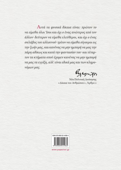 Αυτά τα φυσικά δίκαια είναι: πρώτον το να είμεθα όλοι Ίσοι και όχι ο ένας ανώτερος από τον άλλον· δεύτερον να είμεθα ελεύθεροι, και όχι ο ένας σκλάβος του αλλουνού· τρίτον να είμεθα σίγουροι εις την ζωήν μας, και κανένας να μην ημπορή να μας την πάρη αδίκως και κατά την φαντασίαν του· και τέταρτον τα κτήματα οπού έχομεν κανένας να μην ημπορή να μας τα εγγίξη, αλλ’ είναι εδικά μας και των κληρονόμων μας.