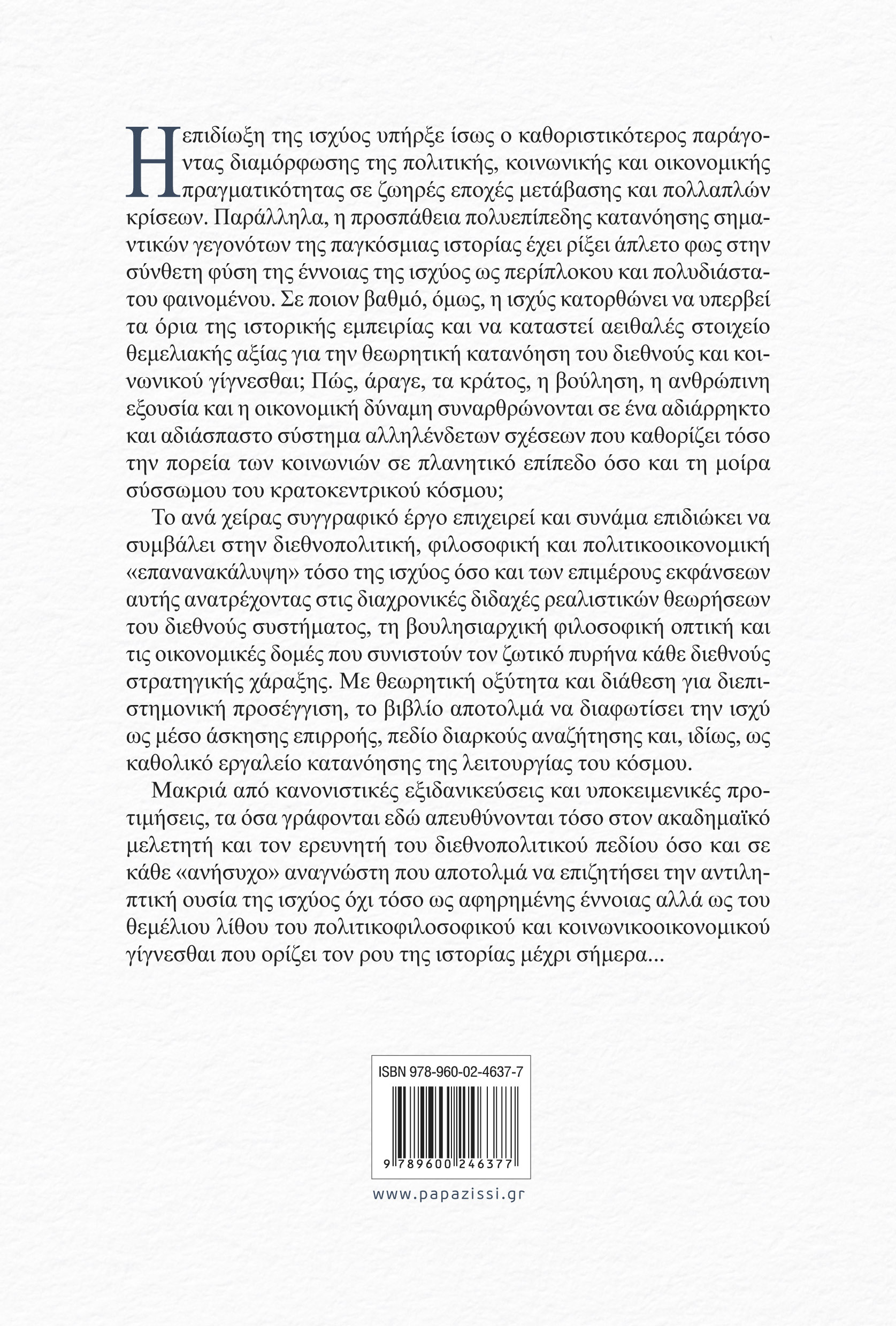 Το ανά χείρας συγγραφικό έργο επιχειρεί και συνάμα επιδιώκει να συμβάλει στην διεθνοπολιτική, φιλοσοφική και πολιτικοοικονομική «επανανακάλυψη» τόσο της ισχύος όσο και των επιμέρους εκφάνσεων αυτής ανατρέχοντας στις διαχρονικές διδαχές ρεαλιστικών θεωρήσεων του διεθνούς συστήματος, τη βουλησιαρχική φιλοσοφική οπτική και τις οικονομικές δομές που συνιστούν τον ζωτικό πυρήνα κάθε διεθνούς στρατηγικής χάραξης. Με θεωρητική οξύτητα και διάθεση για διεπιστημονική προσέγγιση, το βιβλίο αποτολμά να διαφωτίσει την ισχύ ως μέσο άσκησης επιρροής, πεδίο διαρκούς αναζήτησης και, ιδίως, ως καθολικό εργαλείο κατανόησης της λειτουργίας του κόσμου.