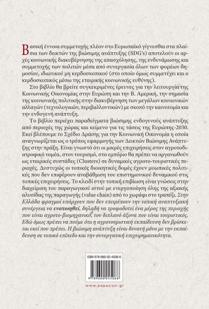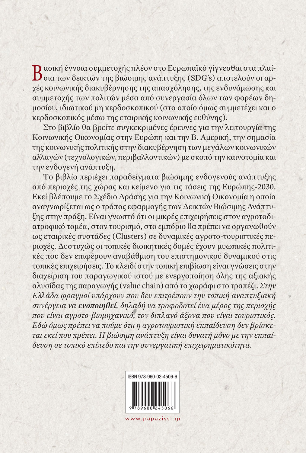 To βιβλίο περιέχει παραδείγματα βιώσιμης ενδογενούς ανάπτυξης από περιοχές της χώρας και κείμενο για τις τάσεις της Ευρώπης-2030. Εκεί βλέπουμε το Σχέδιο Δράσης για την Κοινωνική Οικονομία η οποία αναγνωρίζεται ως ο τρόπος εφαρμογής των Δεικτών Βιώσιμης Ανάπτυξης στην πράξη. Είναι γνωστό ότι οι μικρές επιχειρήσεις στον αγροτοδιατροφικό τομέα, στον τουρισμό, στο εμπόριο θα πρέπει να οργανωθούν ως εταιρικές συστάδες (Clusters) σε δυναμικές αγροτο-τουριστικές περιοχές. Δυστυχώς οι τοπικές διοικητικές δομές έχουν μυωπικές πολιτικές που δεν επιφέρουν αναβάθμιση του επιστημονικού δυναμικού στις τοπικές επιχειρήσεις. Το κλειδί στην τοπική επιβίωση είναι γνώσεις στην διαχείριση του παραγωγικού ιστού με ενεργοποίηση όλης της αξιακής αλυσίδας της παραγωγής (value chain) από το χωράφι στο τραπέζι. Στην Ελλάδα φραγμοί υπάρχουν που δεν επιτρέπουν την τοπική αναπτυξιακή συνέργεια να ενοποιηθεί, δηλαδή να τροφοδοτεί ένα μέρος της περιοχής που είναι αγροτο-βιομηχανικό, τον διπλανό άξονα που είναι τουριστικός. Εδώ όμως πρέπει να πούμε ότι η αγροτουριστική εκπαίδευση δεν βρίσκεται εκεί που πρέπει. Η βιώσιμη ανάπτυξη είναι δυνατή μόνο με την εκπαίδευση σε τοπικό επίπεδο και την συνεργατική επιχειρηματικότητα.