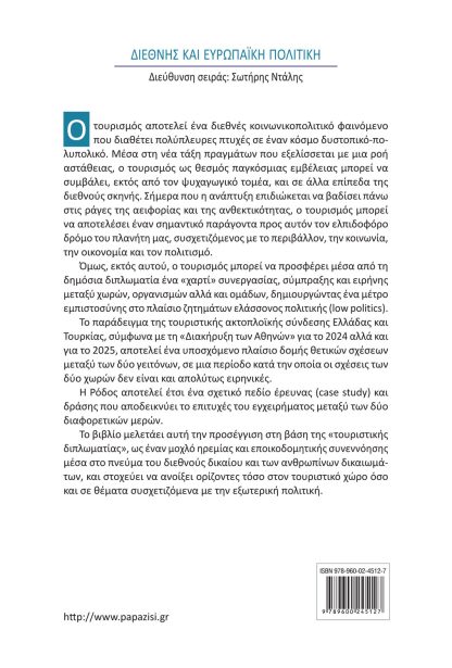 Το βιβλίο μελετάει αυτή την προσέγγιση στη βάση της «τουριστικής διπλωματίας», ως έναν μοχλό ηρεμίας και εποικοδομητικής συνεννόησης μέσα στο πνεύμα του διεθνούς δικαίου και των ανθρωπίνων δικαιωμάτων, και στοχεύει να ανοίξει ορίζοντες τόσο στον τουριστικό χώρο όσο και σε θέματα συσχετιζόμενα με την εξωτερική πολιτική.