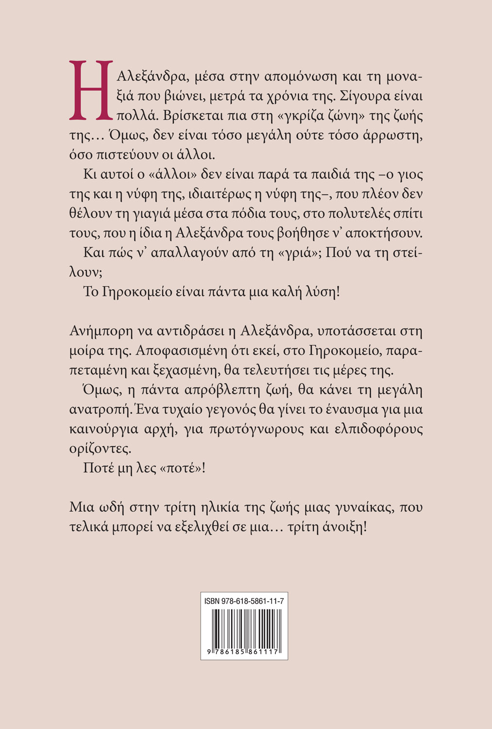 Ανήμπορη να αντιδράσει η Αλεξάνδρα, υποτάσσεται στη μοίρα της. Αποφασισμένη ότι εκεί, στο Γηροκομείο, παραπεταμένη και ξεχασμένη, θα τελευτήσει τις μέρες της.