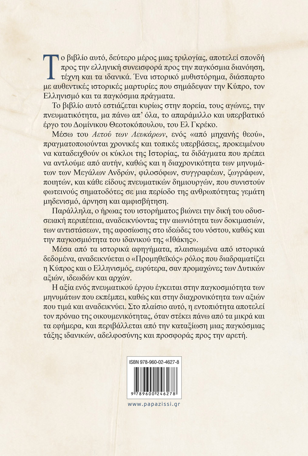 Το βιβλίο αυτό, δεύτερο μέρος μιας τριλογίας, αποτελεί σπονδή προς την ελληνική συνεισφορά προς την παγκόσμια διανόηση, τέχνη και τα ιδανικά. Ένα ιστορικό μυθιστόρημα, διάσπαρτο με αυθεντικές ιστορικές μαρτυρίες που σημάδεψαν την Κύπρο, τον Ελληνισμό και τα παγκόσμια πράγματα.