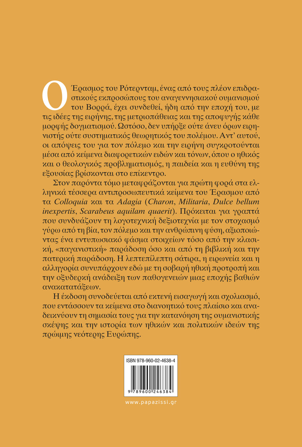 Στον παρόντα τόμο μεταφράζονται για πρώτη φορά στα ελληνικά τέσσερα αντιπροσωπευτικά κείμενα του Έρασμου από τα Colloquia και τα Adagia (Charon, Militaria, Dulce bellum inexpertis, Scarabeus aquilam quaerit). Πρόκειται για γραπτά που συνδυάζουν τη λογοτεχνική δεξιοτεχνία με τον στοχασμό γύρω από τη βία, τον πόλεμο και την ανθρώπινη φύση, αξιοποιώντας ένα εντυπωσιακό φάσμα στοιχείων τόσο από την κλασική, «παγανιστική» παράδοση όσο και από τη βιβλική και την πατερική παράδοση. Η λεπτεπίλεπτη σάτιρα, η ειρωνεία και η αλληγορία συνυπάρχουν εδώ με τη σοβαρή ηθική προτροπή και την οξυδερκή ανάδειξη των παθογενειών μιας εποχής βαθιών ανακατατάξεων.