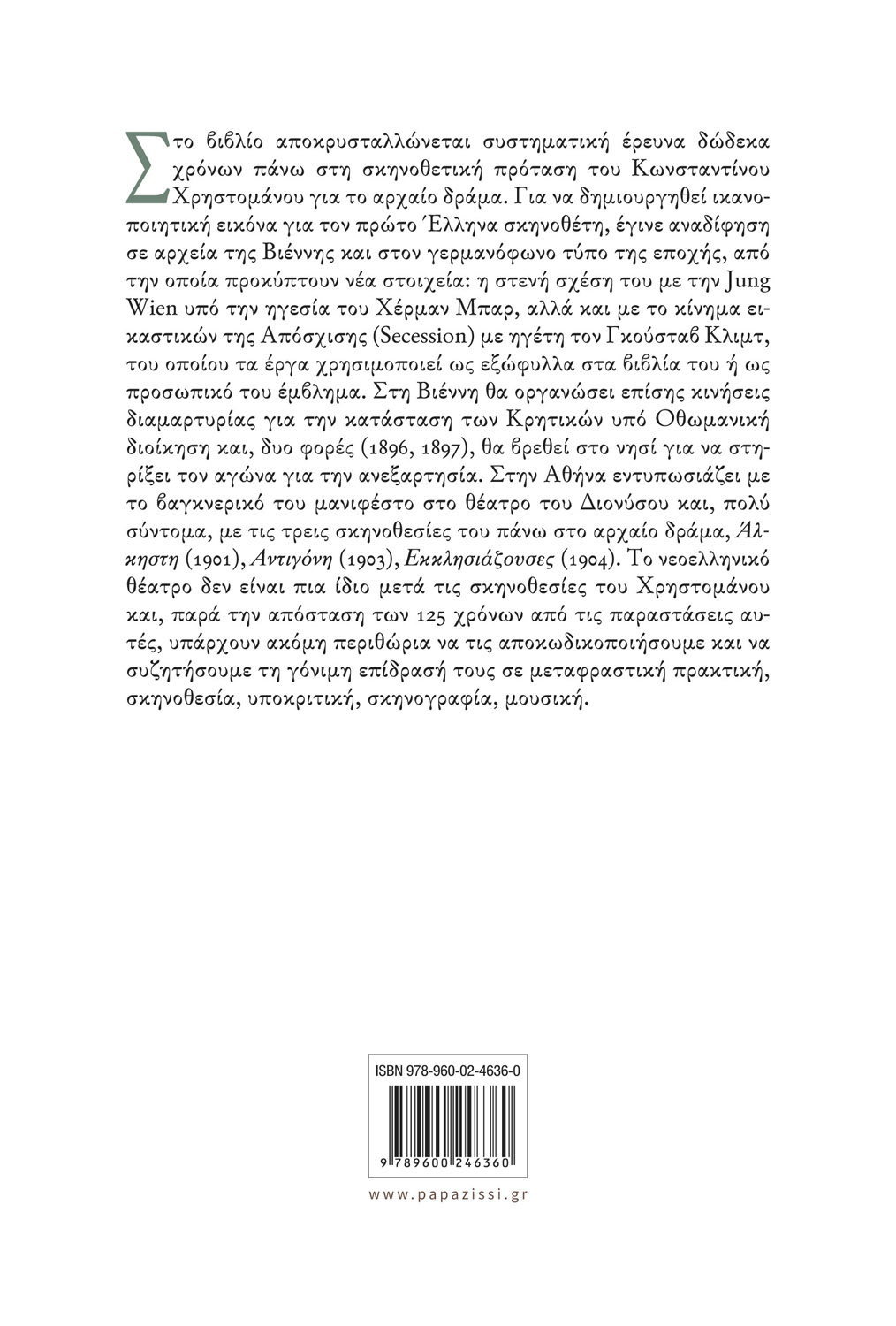 Στο βιβλίο αποκρυσταλλώνεται συστηματική έρευνα δώδεκα χρόνων πάνω στη σκηνοθετική πρόταση του Κωνσταντίνου Χρηστομάνου για το αρχαίο δράμα. Για να δημιουργηθεί ικανοποιητική εικόνα για τον πρώτο Έλληνα σκηνοθέτη, έγινε αναδίφηση σε αρχεία της Βιέννης και στον γερμανόφωνο τύπο της εποχής, από την οποία προκύπτουν νέα στοιχεία: η στενή σχέση του με την Jung Wien υπό την ηγεσία του Χέρμαν Μπαρ, αλλά και με το κίνημα εικαστικών της Απόσχισης (Secession) με ηγέτη τον Γκούσταβ Κλιμτ, του οποίου τα έργα χρησιμοποιεί ως εξώφυλλα στα βιβλία του ή ως προσωπικό του έμβλημα. Στη Βιέννη θα οργανώσει επίσης κινήσεις διαμαρτυρίας για την κατάσταση των Κρητικών υπό Οθωμανική διοίκηση και, δυο φορές (1896, 1897), θα βρεθεί στο νησί για να στηρίξει τον αγώνα για την ανεξαρτησία. Στην Αθήνα εντυπωσιάζει με το βαγκνερικό του μανιφέστο στο θέατρο του Διονύσου και, πολύ σύντομα, με τις τρεις σκηνοθεσίες του πάνω στο αρχαίο δράμα, Άλκηστη (1901), Αντιγόνη (1903), Εκκλησιάζουσες (1904). Το νεοελληνικό θέατρο δεν είναι πια ίδιο μετά τις σκηνοθεσίες του Χρηστομάνου και, παρά την απόσταση των 125 χρόνων από τις παραστάσεις αυτές, υπάρχουν ακόμη περιθώρια να τις αποκωδικοποιήσουμε και να συζητήσουμε τη γόνιμη επίδρασή τους σε μεταφραστική πρακτική, σκηνοθεσία, υποκριτική, σκηνογραφία, μουσική.