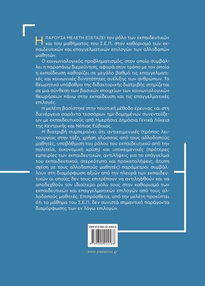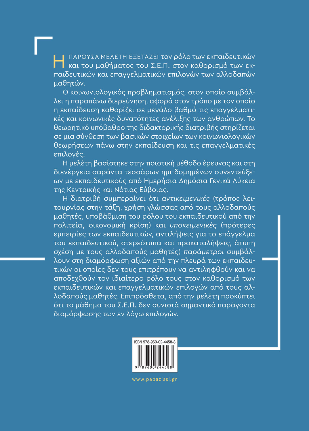 Η παρούσα μελέτη εξετάζει τον ρόλο των εκπαιδευτικών και του μαθήματος του Σ.Ε.Π. στον καθορισμό των εκπαιδευτικών και επαγγελματικών επιλογών των αλλοδαπών μαθητών.