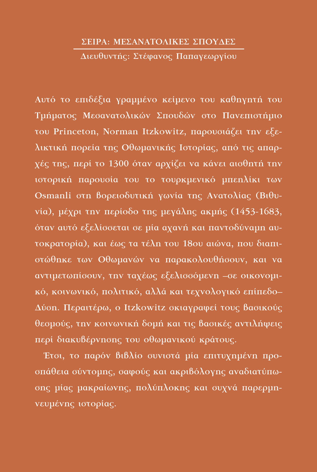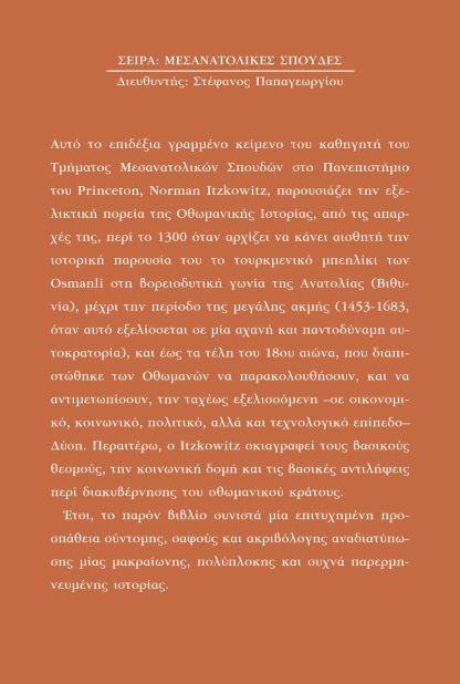 Αυτό το επιδέξια γραμμένο κείμενο του καθηγητή του Τμήματος Μεσανατολικών Σπουδών στο Πανεπιστήμιο του Princeton, Norman Itzkowitz, παρουσιάζει την εξελικτική πορεία της Οθωμανικής Ιστορίας, από τις απαρχές της, περί το 1300 όταν αρχίζει να κάνει αισθητή την ιστορική παρουσία του το τουρκμενικό μπεηλίκι των Osmanli στη βορειοδυτική γωνία της Ανατολίας (Βιθυνία), μέχρι την περίοδο της μεγάλης ακμής (1453-1683, όταν αυτό εξελίσσεται σε μια αχανή και παντοδύναμη αυτοκρατορία), και έως τα τέλη του 18ου αιώνα, που διαπιστώθηκε η αδυναμία των Οθωμανών να παρακολουθήσουν, και να αντιμετωπίσουν, την ταχέως εξελισσόμενη – σε οικονομικό, κοινωνικό, πολιτικό, αλλά και τεχνολογικό επίπεδο – Δύση. Περαιτέρω, ο Itzkowitz σκιαγραφεί τους βασικούς θεσμούς, την κοινωνική δομή και τις βασικές αντιλήψεις περί διακυβέρνησης του οθωμανικού κράτους. Έτσι, το παρόν βιβλίο συνιστά μια επιτυχημένη προσπάθεια σύντομης, σαφούς και ακριβόλογης αναδιατύπωσης μίας μακραίωνης, πολύπλοκης και συχνά παρερμηνευμένης ιστορίας.