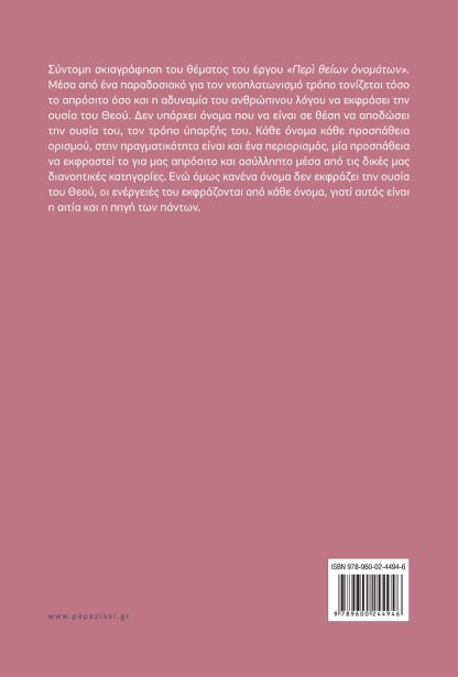 Σύντομη σκιαγράφηση του θέματος του έργου «Περὶ θείων ὀνομάτων». Μέσα από ένα παραδοσιακό για τον νεοπλατωνισμό τρόπο τονίζεται τόσο το απρόσιτο όσο και η αδυναμία του ανθρώπινου λόγου να εκφράσει την ουσία του Θεού. Δεν υπάρχει όνομα που να είναι σε θέση να αποδώσει την ουσία του, τον τρόπο ύπαρξής του. Κάθε όνομα κάθε προσπάθεια ορισμού, στην πραγματικότητα είναι και ένα περιορισμός, μία προσπάθεια να εκφραστεί το για μας απρόσιτο και ασύλληπτο μέσα από τις δικές μας διανοητικές κατηγορίες. Ενώ όμως κανένα όνομα δεν εκφράζει την ουσία του Θεού, οι ενέργειές του εκφράζονται από κάθε όνομα, γιατί αυτός είναι η αιτία και η πηγή των πάντων.