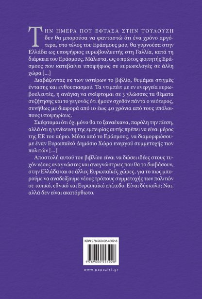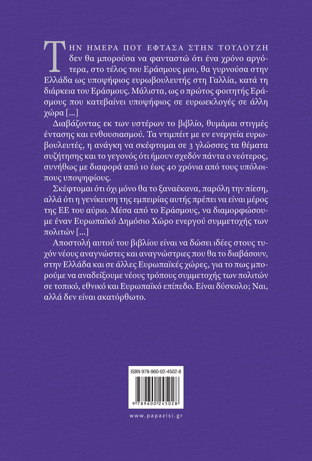 Αποστολή αυτού του βιβλίου είναι να δώσει ιδέες στους τυχόν νέους αναγνώστες και αναγνώστριες που θα το διαβάσουν, στην Ελλάδα και σε άλλες Ευρωπαϊκές χώρες, για το πως μπορούμε να αναδείξουμε νέους τρόπους συμμετοχής των πολιτών σε τοπικό, εθνικό και Ευρωπαϊκό επίπεδο. Είναι δύσκολο; Ναι, αλλά δεν είναι ακατόρθωτο.