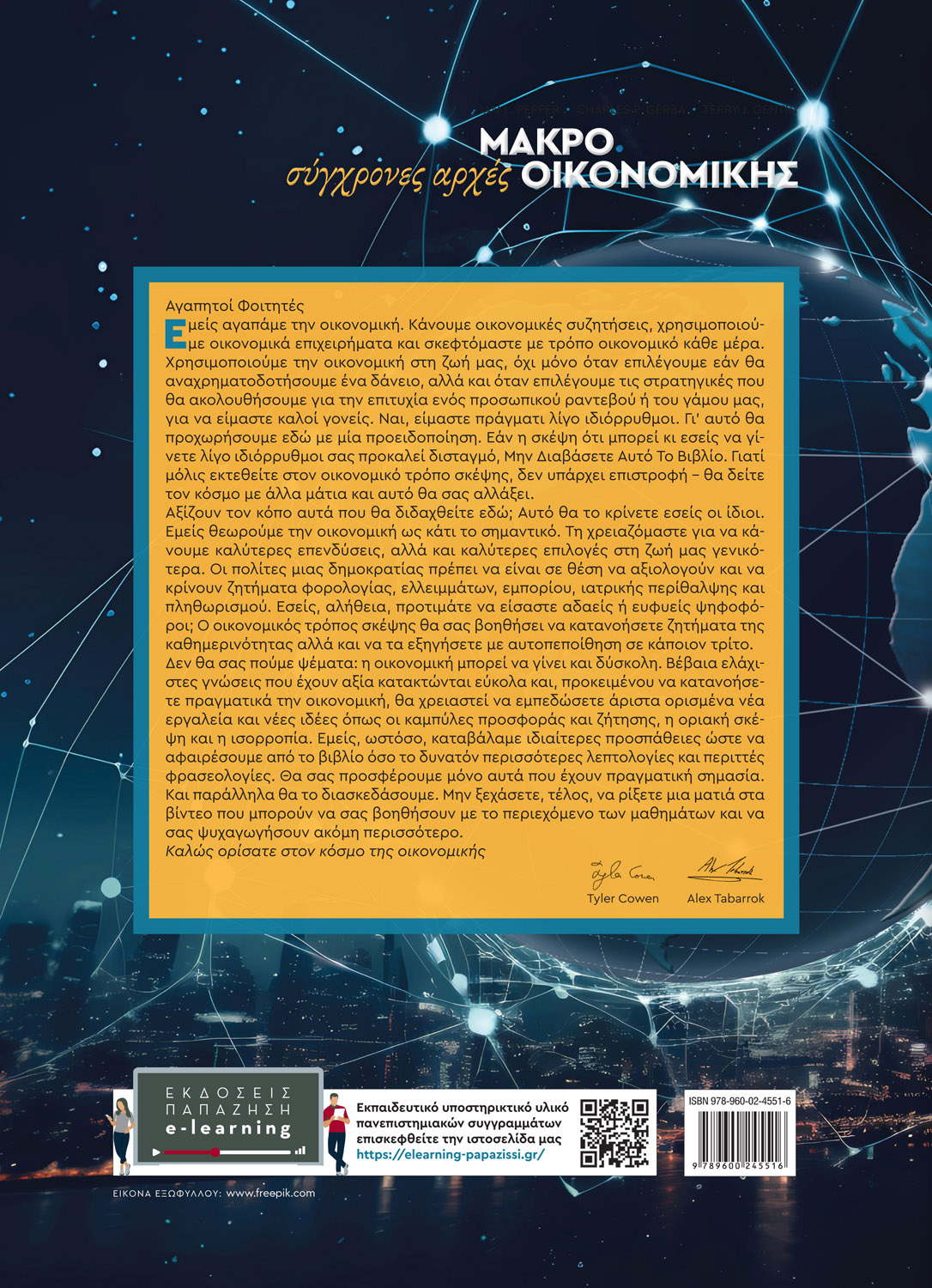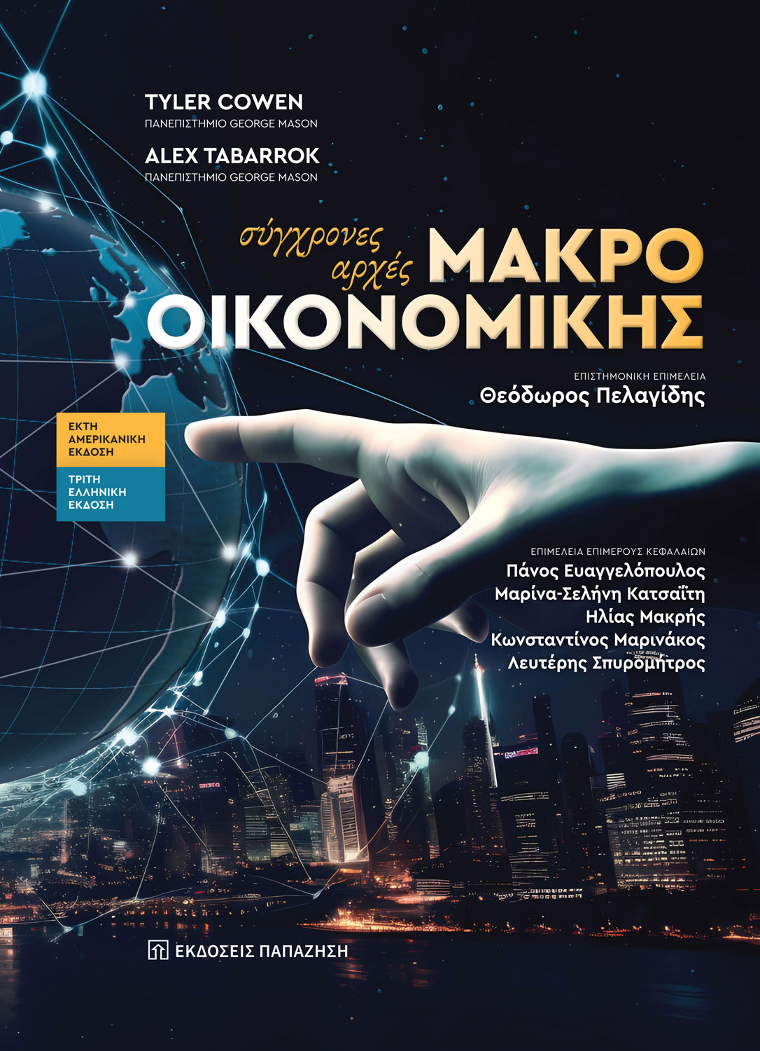 Η τρίτη ελληνική έκδοση (έκτη αμερικανική) του Σύγχρονες αρχές Μακροοικονομικής των T. Cowen και Α. Tabarrok που προσφέρουν στο ελληνικό κοινό οι εκδόσεις Παπαζήση, διαθέτει νέα κάλυψη και ενημερώσεις σε όλη την έκταση της προηγούμενης εκδοχής του συναρπαστικού αυτού εγχειριδίου.