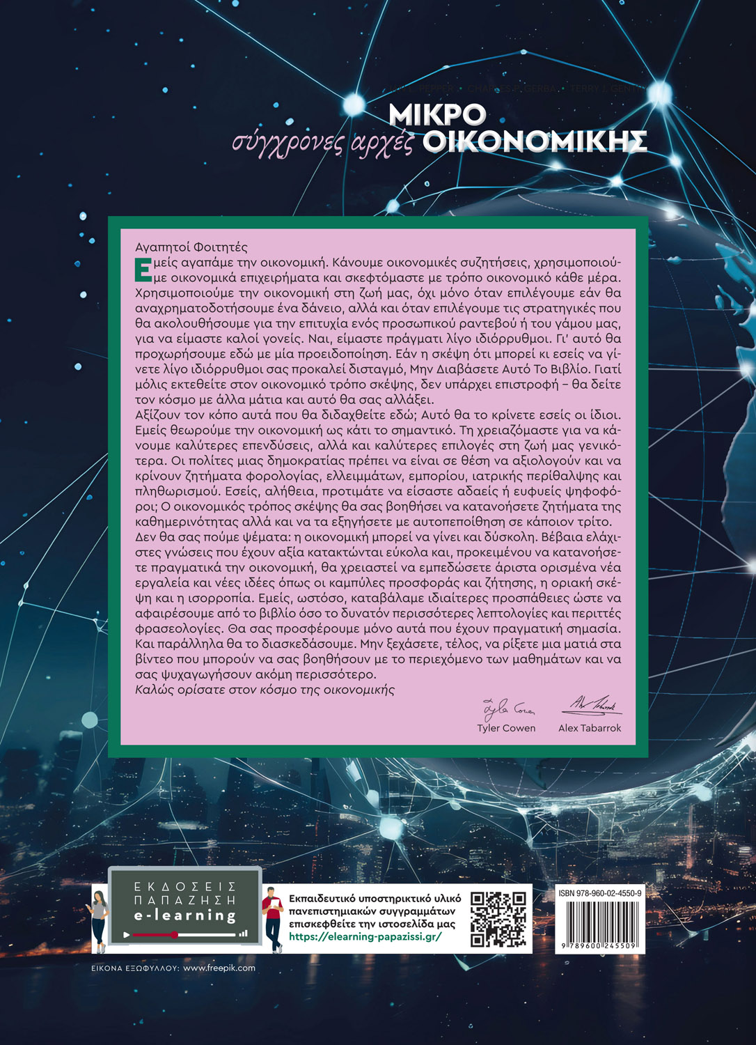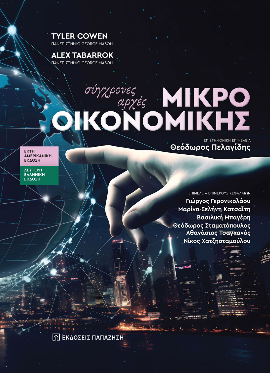 Η δεύτερη ελληνική έκδοση (έκτη αμερικανική έκδοση) του Σύγχρονες αρχές Μικροοικονομικής των T. Cowen και Α. Tabarrok που προσφέρουν στο ελληνικό κοινό οι εκδόσεις Παπαζήση, διαθέτει νέα κάλυψη και ενημερώσεις σε όλη την έκταση της προηγούμενης εκδοχής του συναρπαστικού αυτού εγχειριδίου.