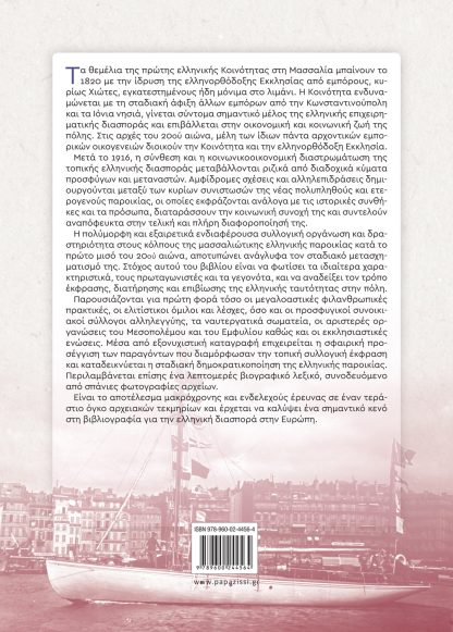 Η πολύμορφη και εξαιρετικά ενδιαφέρουσα συλλογική οργάνωση και δραστηριότητα στους κόλπους της μασσαλιώτικης ελληνικής παροικίας κατά το πρώτο μισό του 20ού αιώνα, αποτυπώνει ανάγλυφα τον σταδιακό μετασχηματισμό της. Στόχος αυτού του βιβλίου είναι να φωτίσει τα ιδιαίτερα χαρακτηριστικά, τους πρωταγωνιστές και τα γεγονότα, και να αναδείξει τον τρόπο έκφρασης, διατήρησης και επιβίωσης της ελληνικής ταυτότητας στην πόλη.
