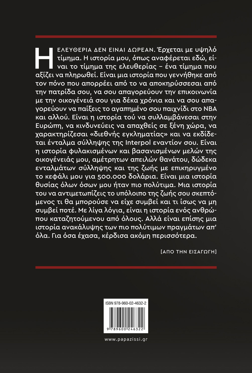 Η ελευθερία δεν είναι δωρεάν. Έρχεται με υψηλό τίμημα. Η ιστορία μου, όπως αναφέρεται εδώ, είναι το τίμημα της ελευθερίας – ένα τίμημα που αξίζει να πληρωθεί. Είναι μια ιστορία που γεννήθηκε από τον πόνο που απορρέει από το να αποκηρύσσεσαι από την πατρίδα σου, να σου απαγορεύουν την επικοινωνία με την οικογένειά σου για δέκα χρόνια και να σου απαγορεύουν να παίξεις το αγαπημένο σου παιχνίδι στο NBA και αλλού. Είναι η ιστορία τού να συλλαμβάνεσαι στην Ευρώπη, να κινδυνεύεις να απαχθείς σε ξένη χώρα, να χαρακτηρίζεσαι «διεθνής εγκληματίας» και να εκδίδεται ένταλμα σύλληψης της Interpol εναντίον σου. Είναι η ιστορία φυλακισμένων και βασανισμένων μελών της οικογένειάς μου, αμέτρητων απειλών θανάτου, δώδεκα ενταλμάτων σύλληψης και της ζωής με επικηρυγμένο το κεφάλι μου για 500.000 δολάρια. Είναι μια ιστορία θυσίας όλων όσων μου ήταν πιο πολύτιμα. Μια ιστορία του να αντιμετωπίζεις το υπόλοιπο της ζωής σου σκεπτόμενος τι θα μπορούσε να είχε συμβεί και τι ίσως να μη συμβεί ποτέ. Με λίγα λόγια, είναι η ιστορία ενός ανθρώπου καταζητούμενου από όλους. Αλλά είναι επίσης μια ιστορία ανακάλυψης των πιο πολύτιμων πραγμάτων απ’ όλα. Για όσα έχασα, κέρδισα ακόμη περισσότερα.