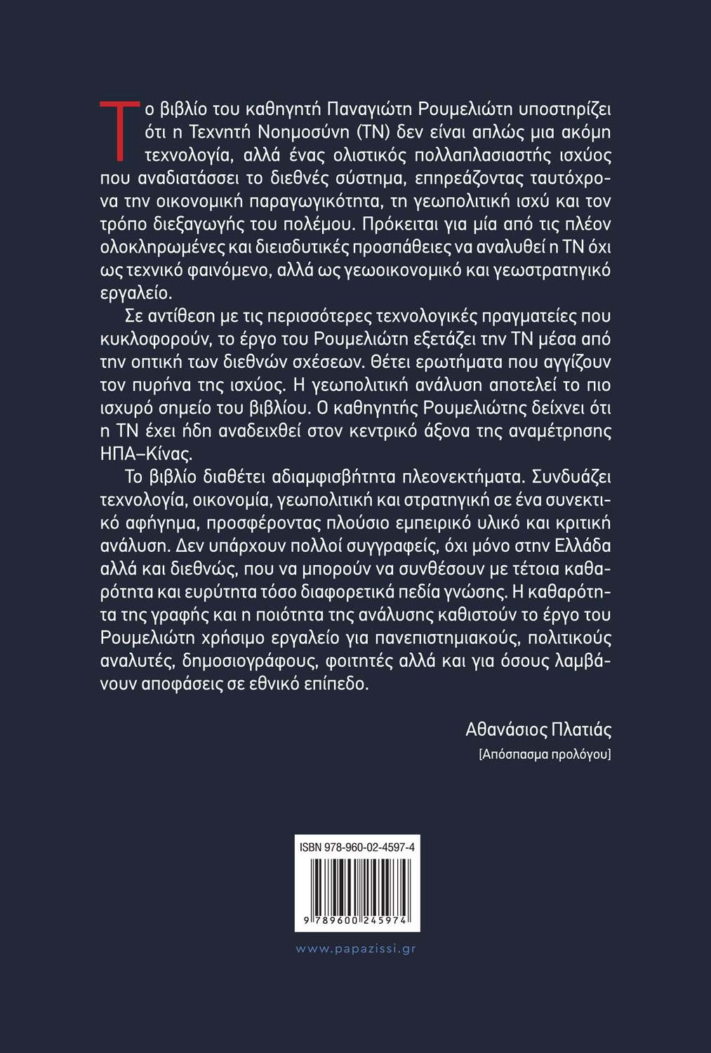 Το βιβλίο του καθηγητή Παναγιώτη Ρουμελιώτη υποστηρίζει ότι η Τεχνητή Νοημοσύνη (ΤΝ) δεν είναι απλώς μια ακόμη τεχνολογία, αλλά ένας ολιστικός πολλαπλασιαστής ισχύος που αναδιατάσσει το διεθνές σύστημα, επηρεάζοντας ταυτόχρονα την οικονομική παραγωγικότητα, τη γεωπολιτική ισχύ και τον τρόπο διεξαγωγής του πολέμου. Πρόκειται για μία από τις πλέον ολοκληρωμένες και διεισδυτικές προσπάθειες να αναλυθεί η ΤΝ όχι ως τεχνικό φαινόμενο, αλλά ως γεωοικονομικό και γεωστρατηγικό εργαλείο.