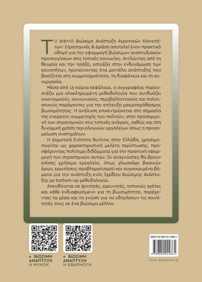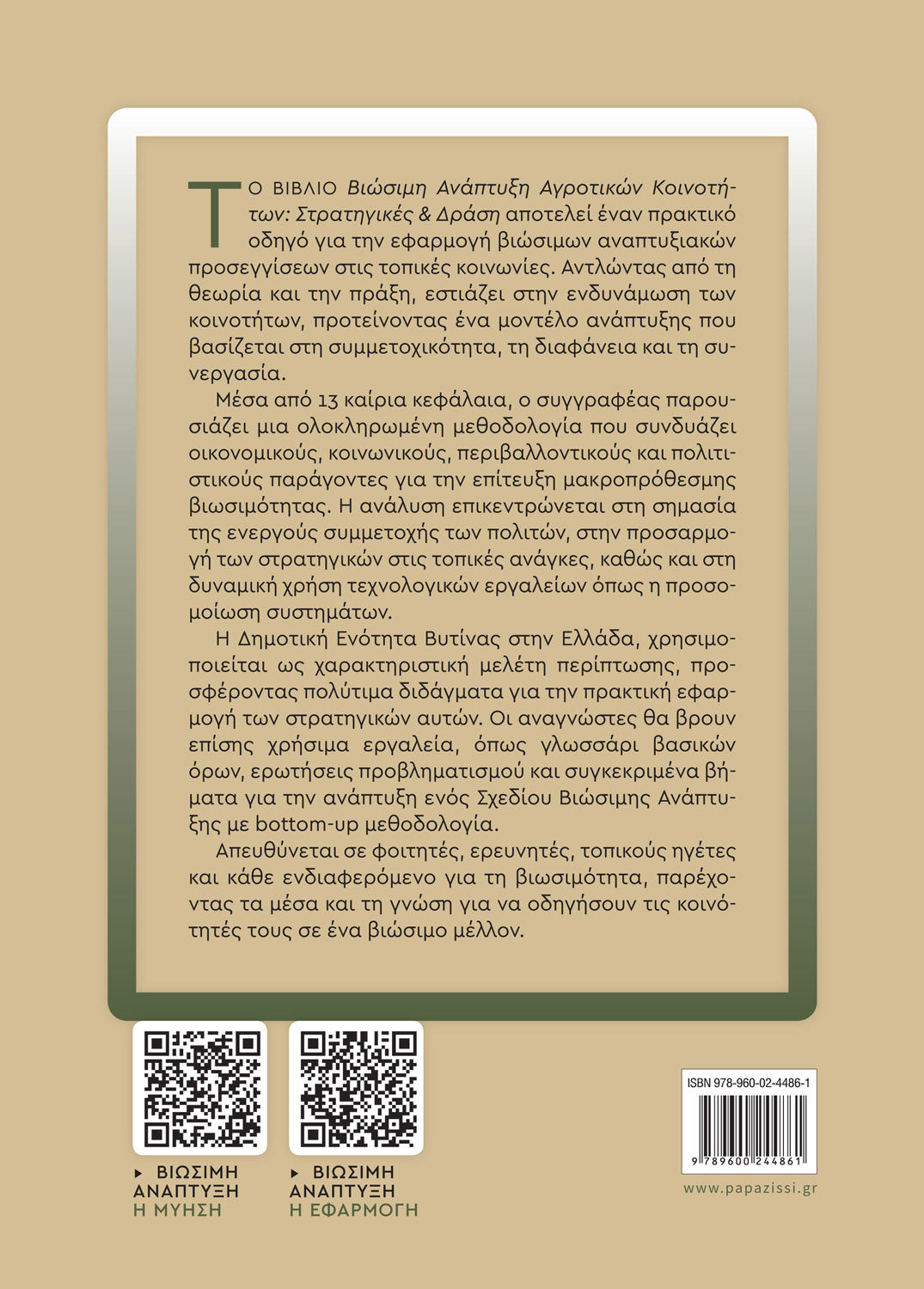 Το βιβλίο Βιώσιμη Ανάπτυξη Αγροτικών Κοινοτήτων: Στρατηγικές & Δράση αποτελεί έναν πρακτικό οδηγό για την εφαρμογή βιώσιμων αναπτυξιακών προσεγγίσεων στις τοπικές κοινωνίες. Αντλώντας από τη θεωρία και την πράξη, εστιάζει στην ενδυνάμωση των κοινοτήτων, προτείνοντας ένα μοντέλο ανάπτυξης που βασίζεται στη συμμετοχικότητα, τη διαφάνεια και τη συνεργασία.