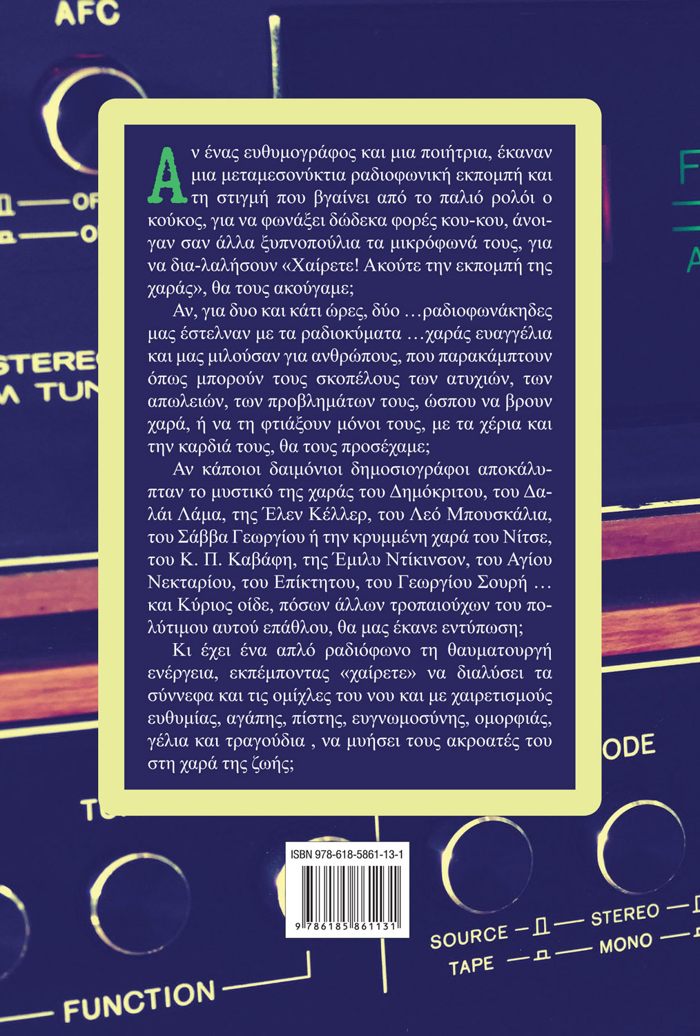 Κι έχει ένα απλό ραδιόφωνο τη θαυματουργή ενέργεια, εκπέμποντας «χαίρετε» να διαλύσει τα σύννεφα και τις ομίχλες του νου και με χαιρετισμούς ευθυμίας, αγάπης, πίστης, ευγνωμοσύνης, ομορφιάς, γέλια και τραγούδια , να μυήσει τους ακροατές του στη χαρά της ζωής;